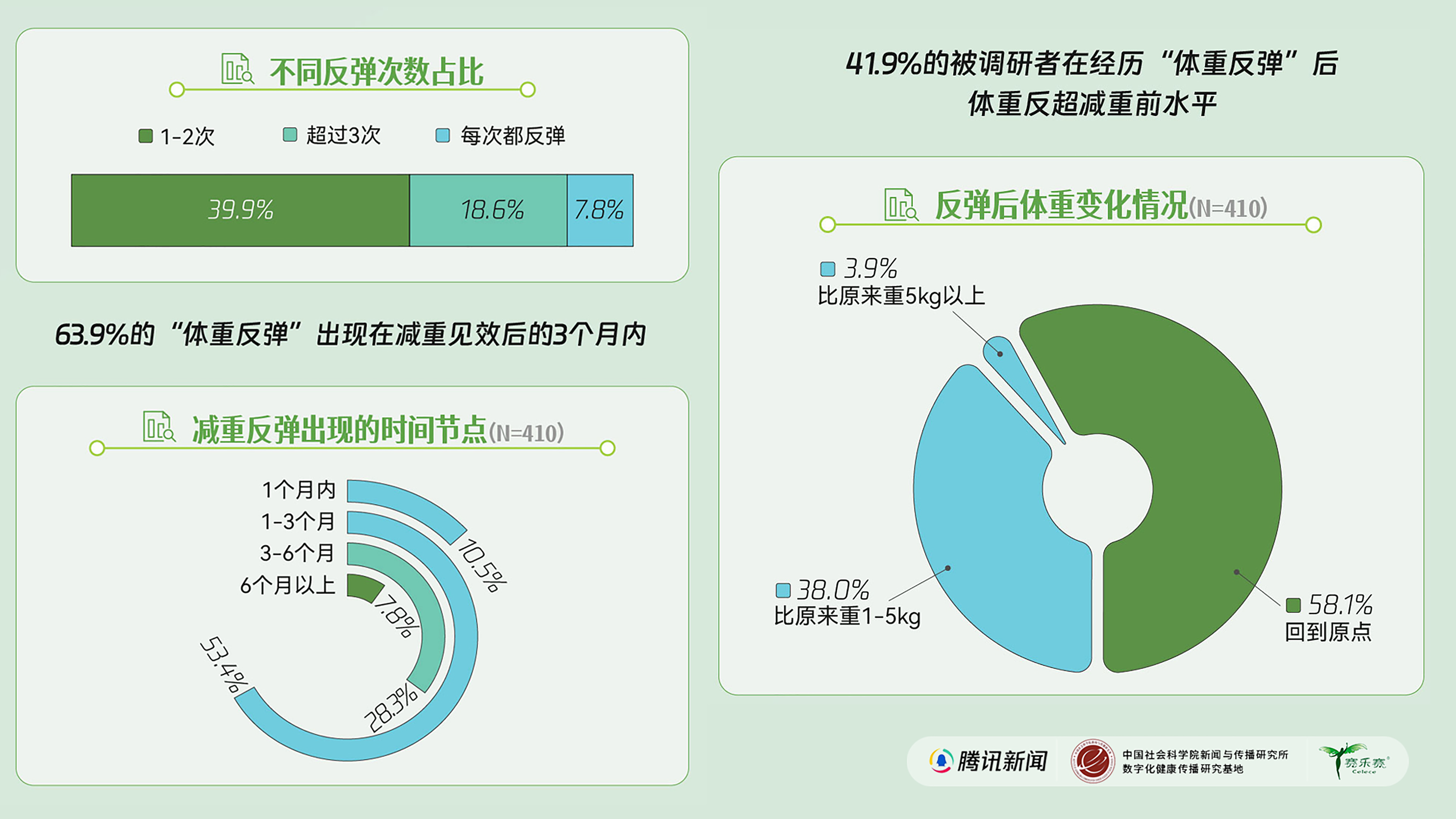 《蓝皮书》进一步揭示,在近一年内有减重失败经历的“减肥困难群体”中,66.3%的人曾遭遇“体重反弹”。更令人担忧的是,反弹发生速度极快,63.9%的反弹出现在减重见效后的3个月内,且有41.9%的反弹者体重甚至反超减重前水平。