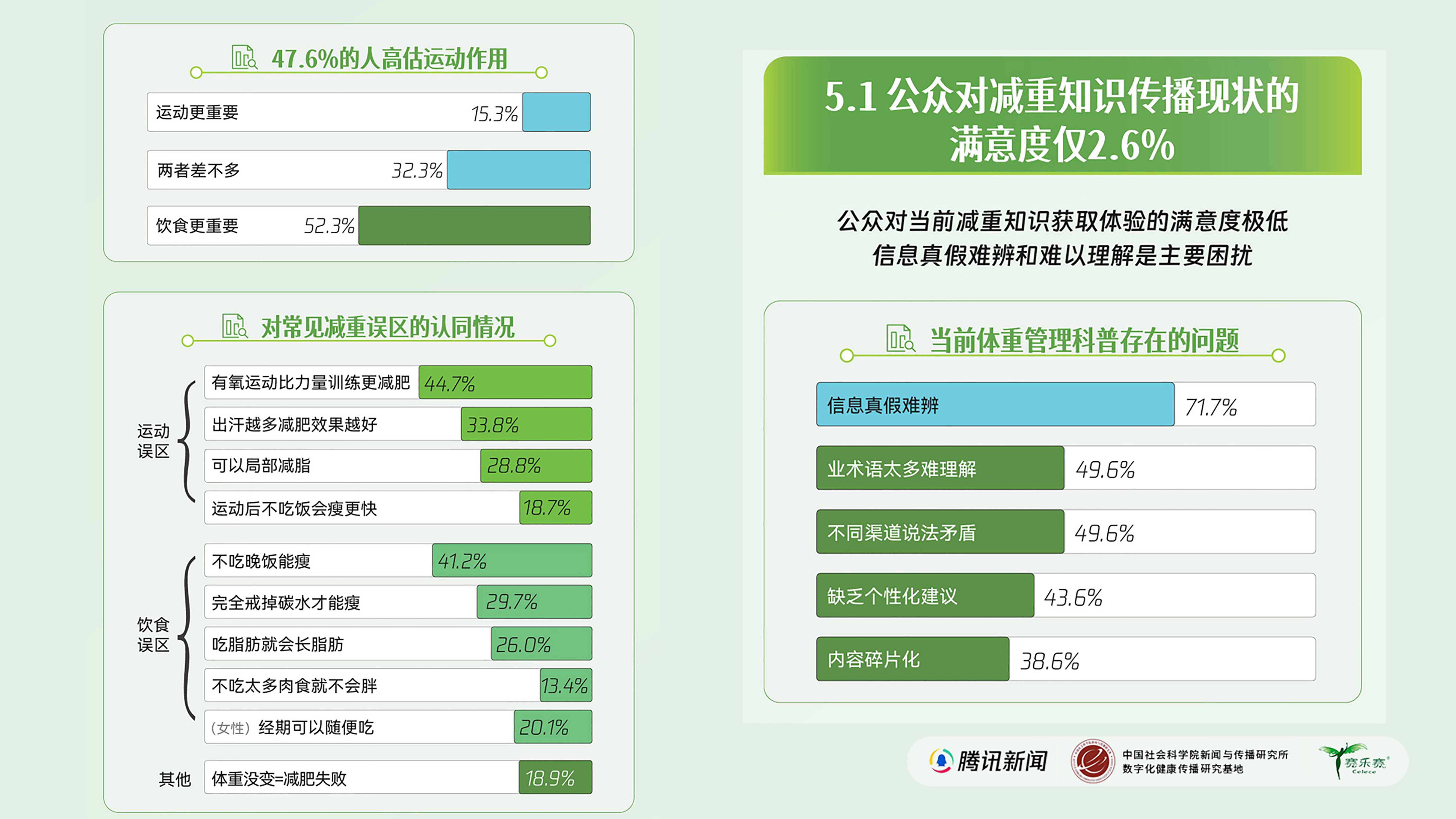调查发现,大众在减重认知上存在显著误区。近半数(47.6%)被调研者高估了运动的作用,认为其与饮食控制同等重要或更为关键。同时,对“局部减脂”、“不吃晚饭能瘦”等流行误区的认同率居高不下。